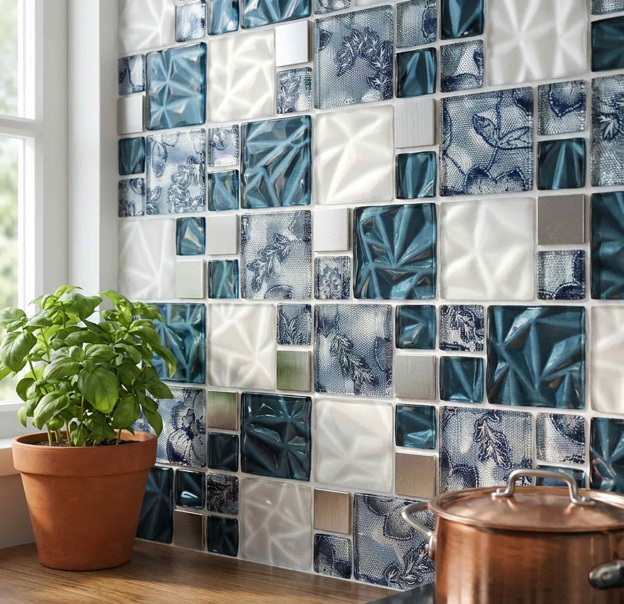 Price £5.14Model CodeReflections mixed metallic blue glass mosaic brick tiles create a sleek, linear finish to kitchen worktops or bathroom edges.read more